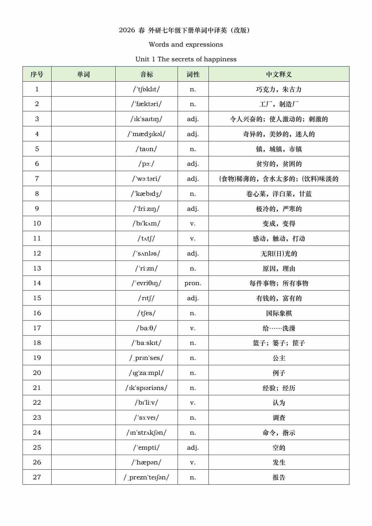 2026 春 外研七年级下册单词中译英(改版)