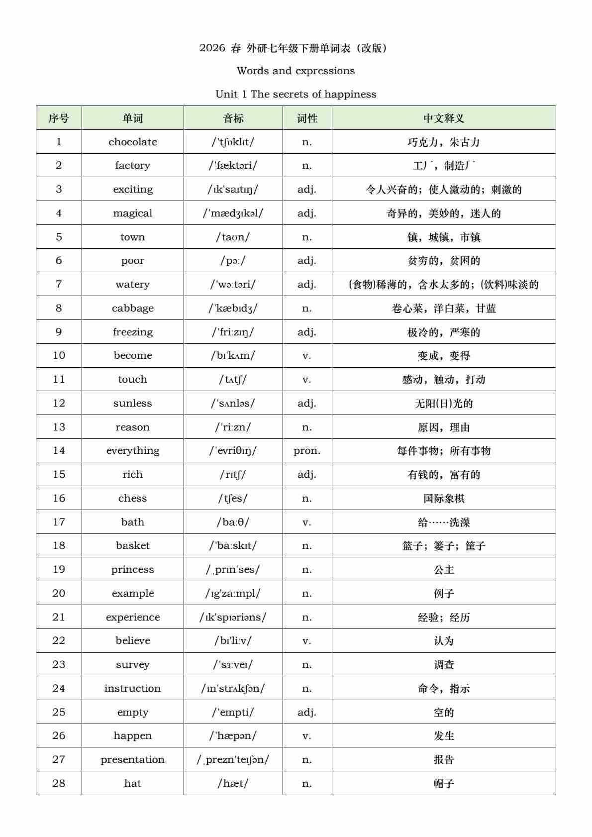 2026 春 外研七年级下册单词表(改版)