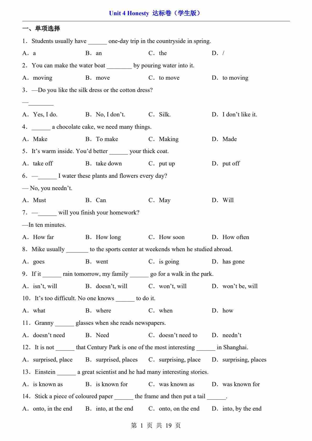 Unit 4 Honesty 【A卷·提升卷】(原卷版)