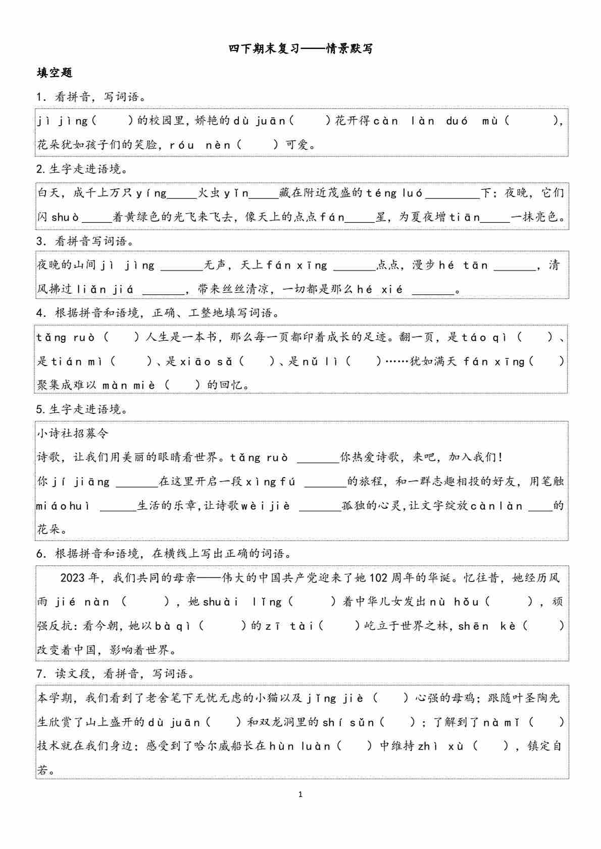 四(下)语文期末复习期末专项《日积月累背诵》测试卷,附答案,期末复习测试用