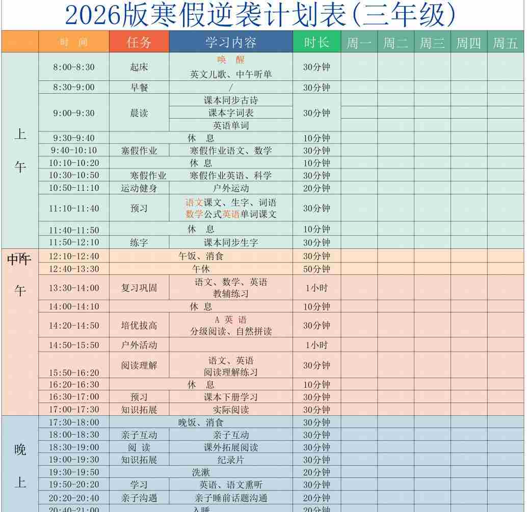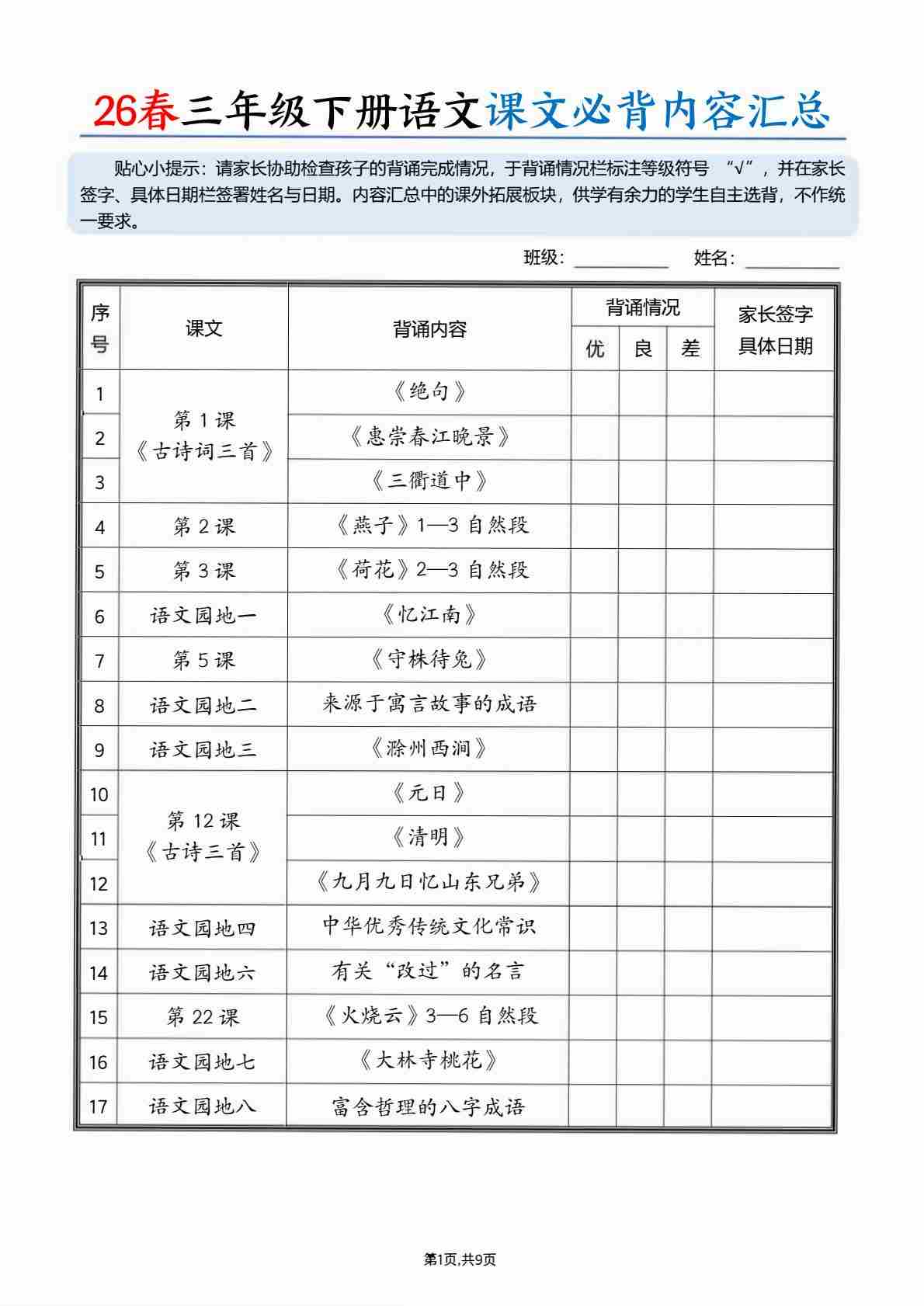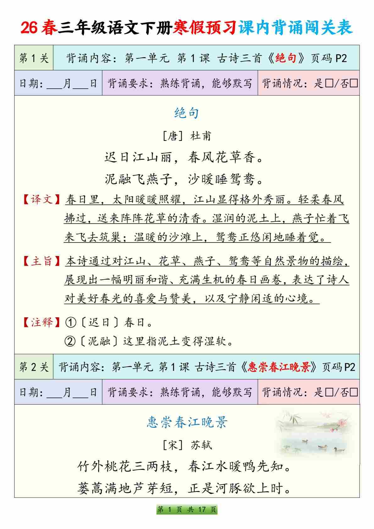 三年级(下)语文 26春新版寒假预习每课晨读单共27页