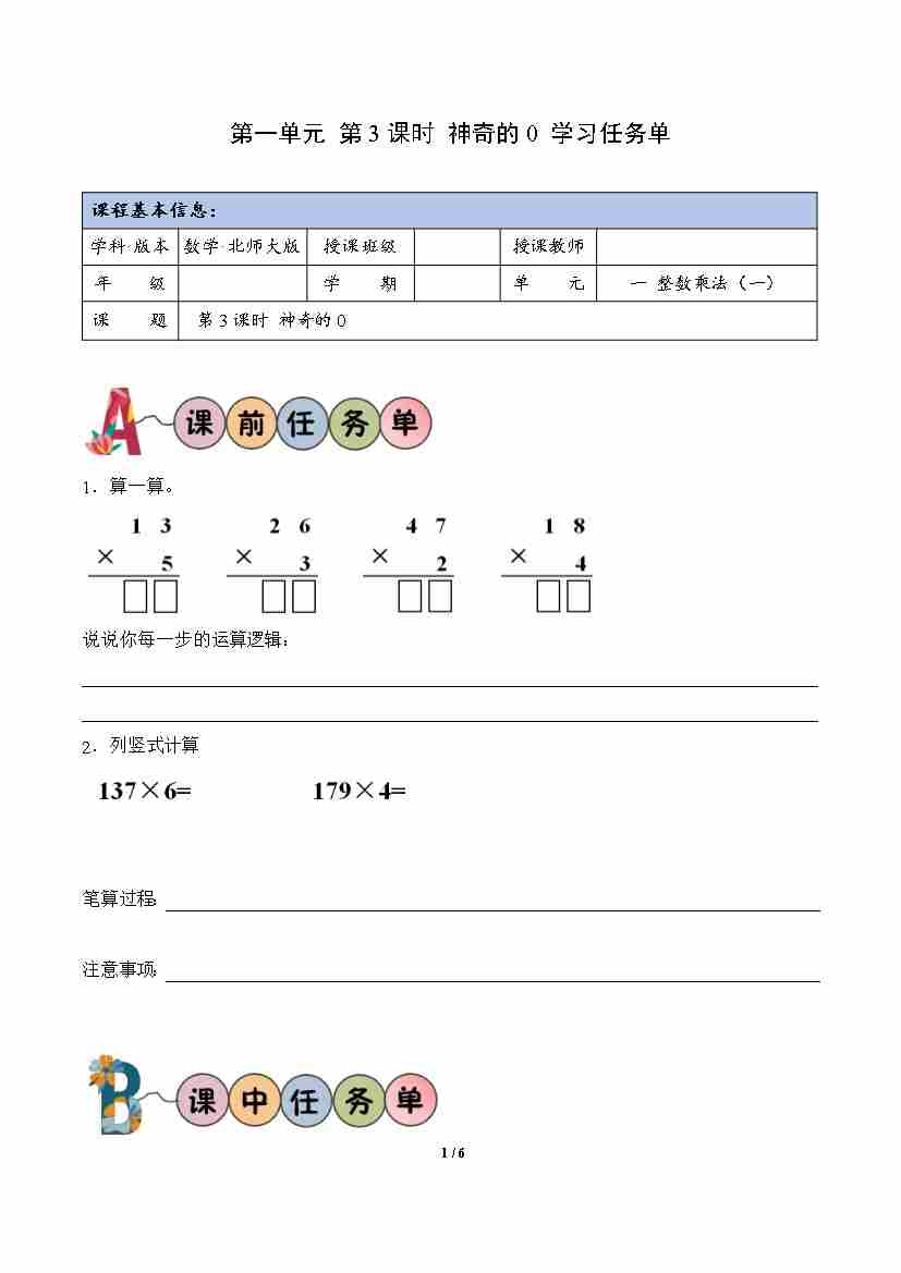第1单元 第3课时 神奇的0(学习任务单)数学北师大版三年级下册(新教材)