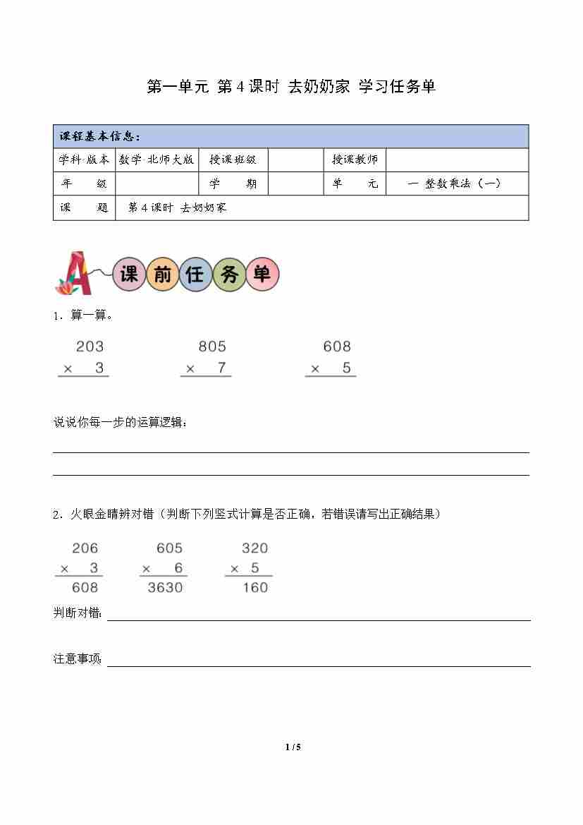 第4单元 第5课时 算得对吗(学习任务单)数学北师大版三年级下册(新教材)
