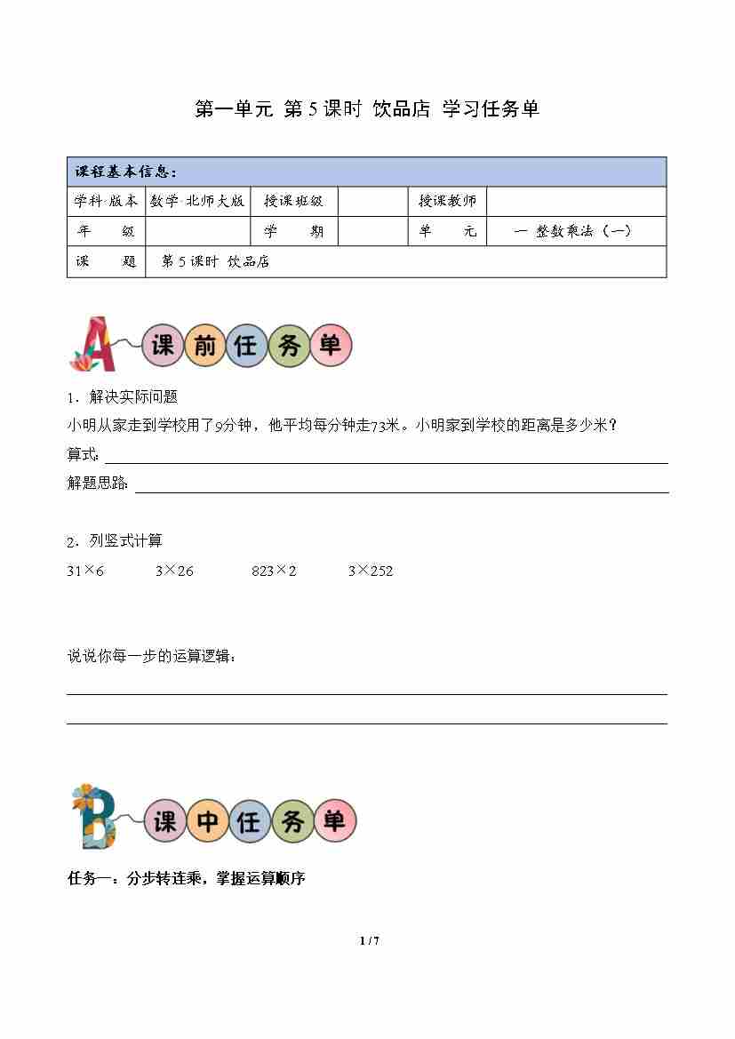 第1单元 第5课时 饮品店(学习任务单)数学北师大版三年级下册(新教材)