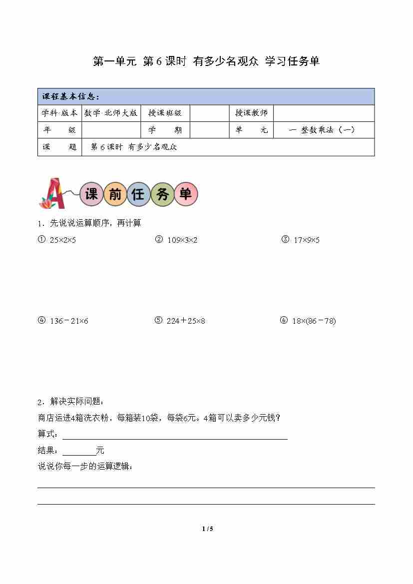 第1单元 第6课时 有多少名观众(学习任务单)数学北师大版三年级下册(新教材)