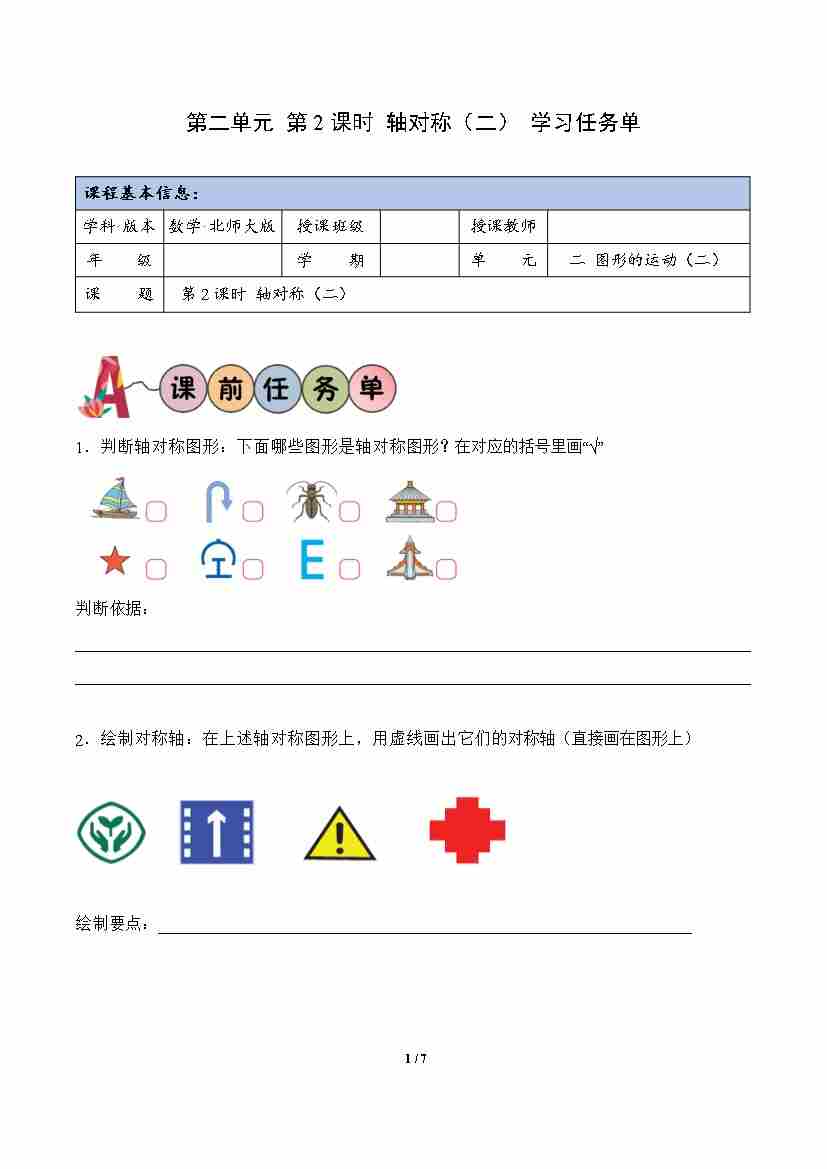 第2单元 第2课时 轴对称(二)(学习任务单)数学北师大版三年级下册(新教材)