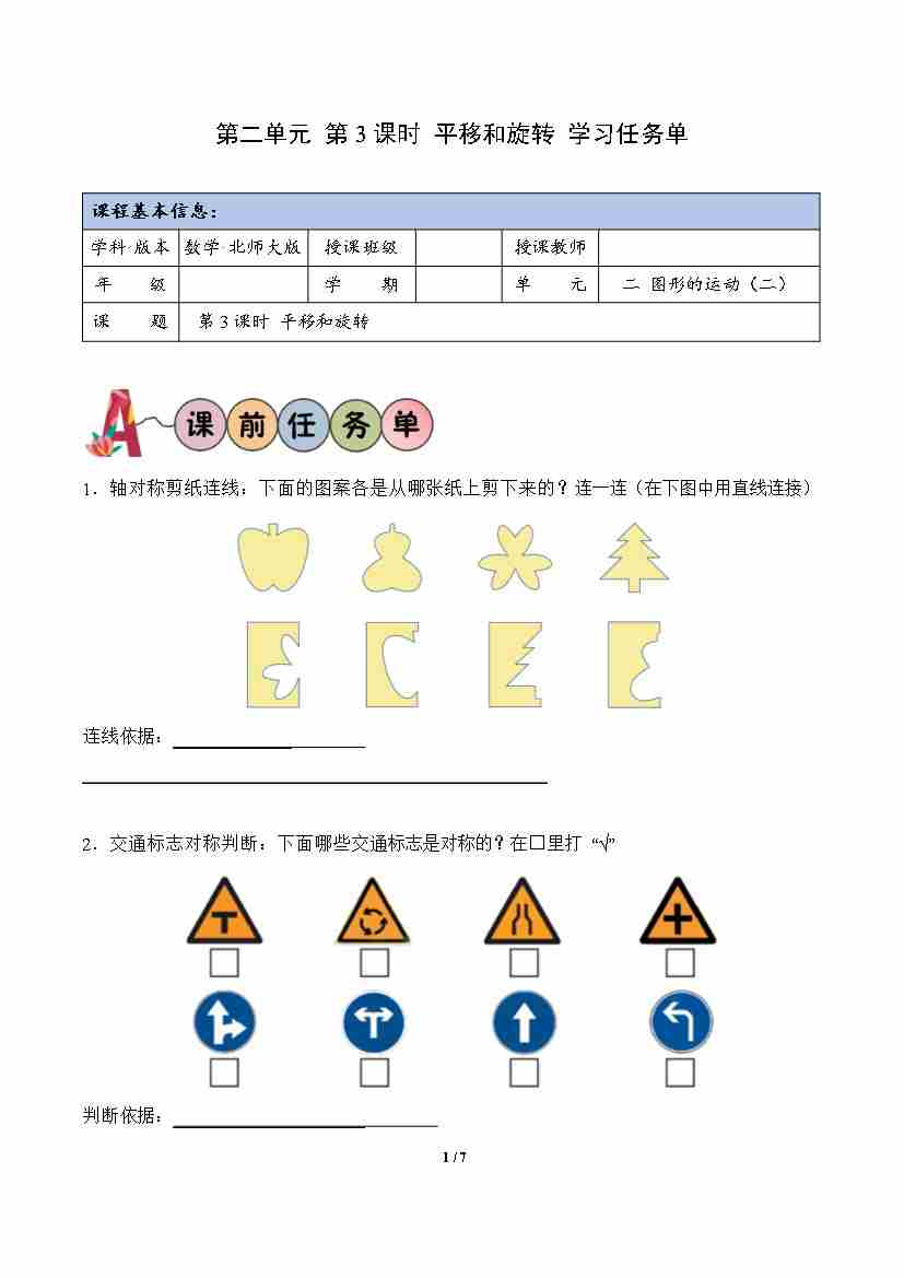 第2单元 第3课时 平移和旋转(学习任务单)数学北师大版三年级下册(新教材)