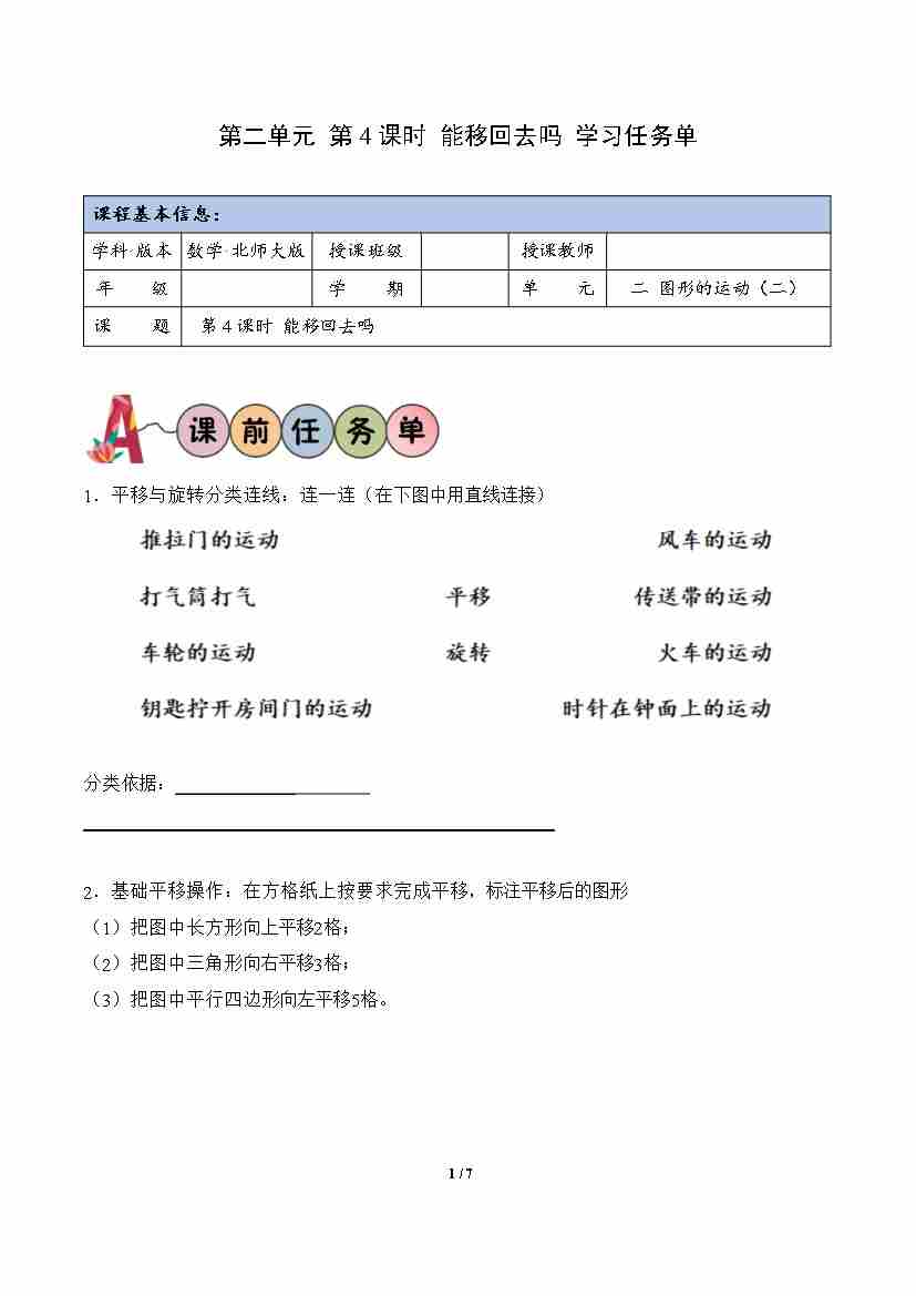 第2单元 第4课时 能移回去吗(学习任务单)数学北师大版三年级下册(新教材)