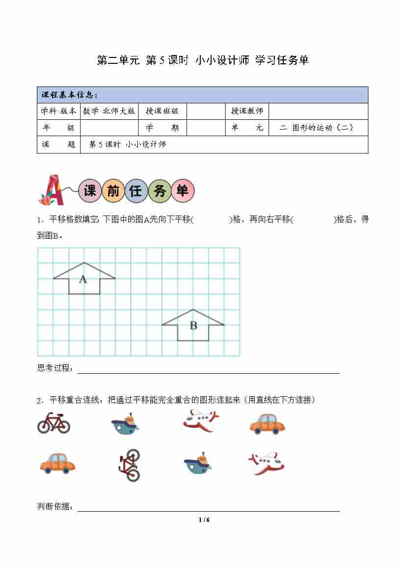 第2单元 第5课时 小小设计师(学习任务单)数学北师大版三年级下册(新教材)
