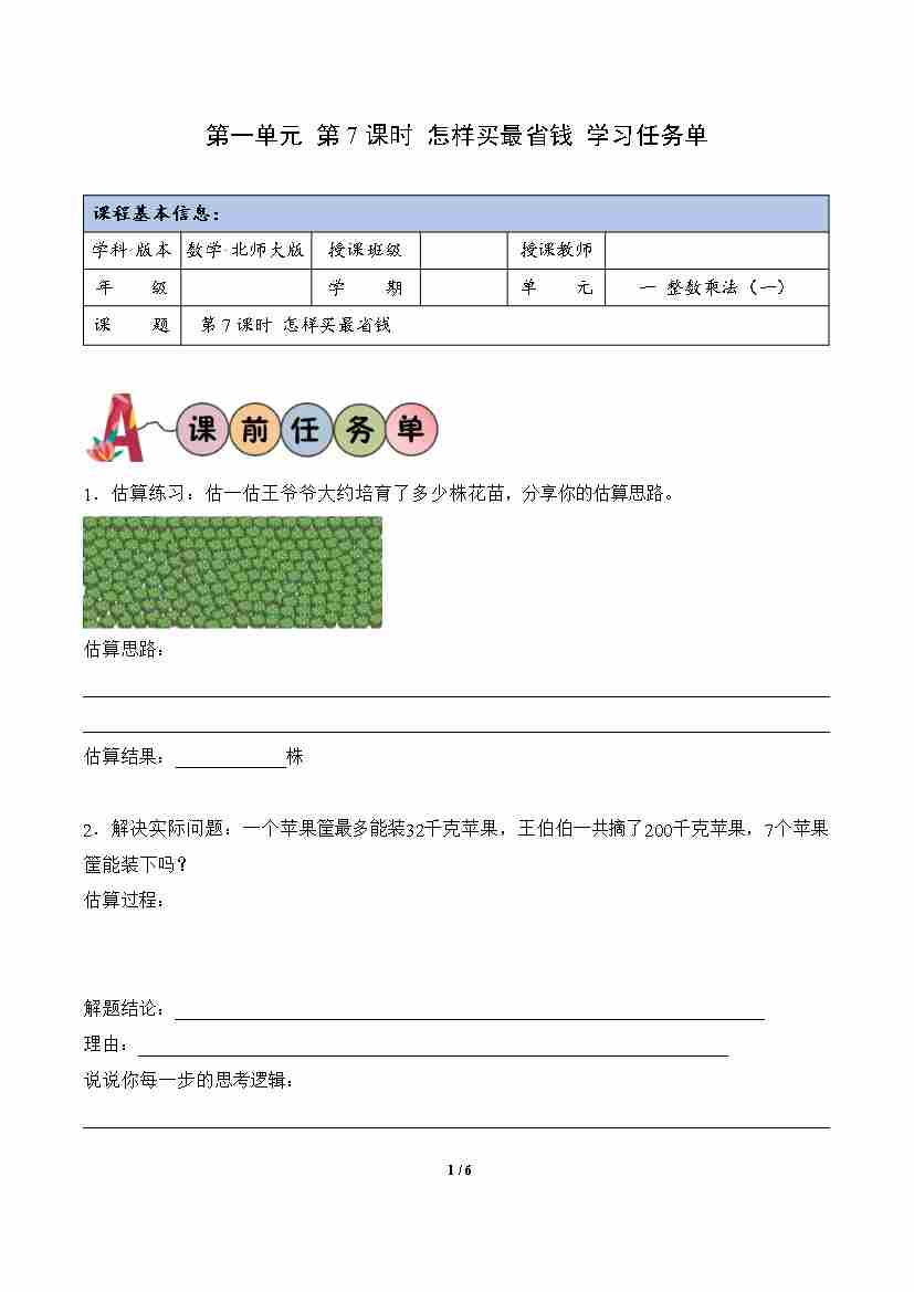 第1单元 第7课时 怎样买最省钱(学习任务单)数学北师大版三年级下册(新教材)