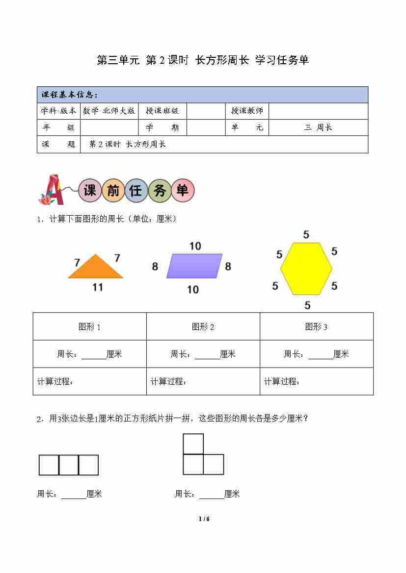 第3单元第2课时 长方形周长(学习任务单)数学北师大版三年级下册(新教材)