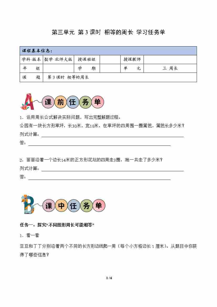 第3单元第3课时 相等的周长(学习任务单)数学北师大版三年级下册(新教材)