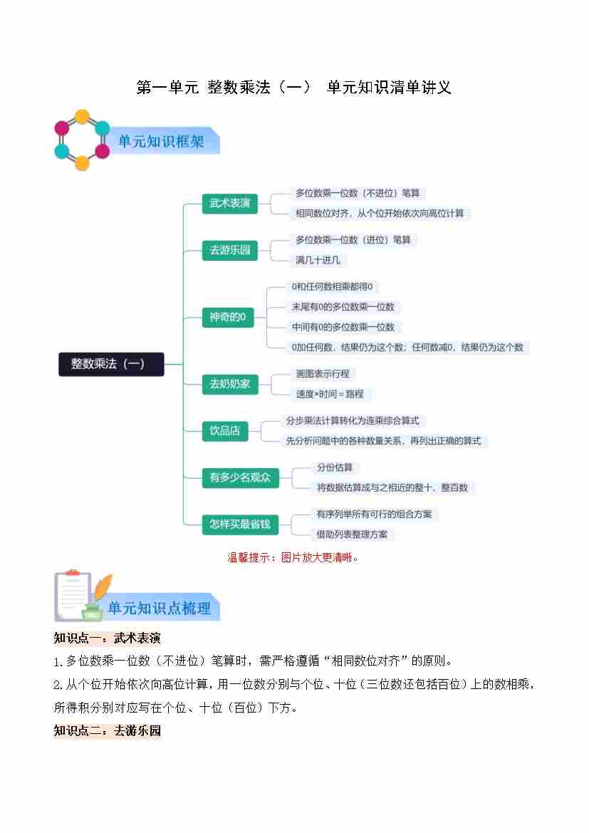第一单元 整数乘法(一)(知识清单)数学北师大版三年级下册(新教材)(原卷版)
