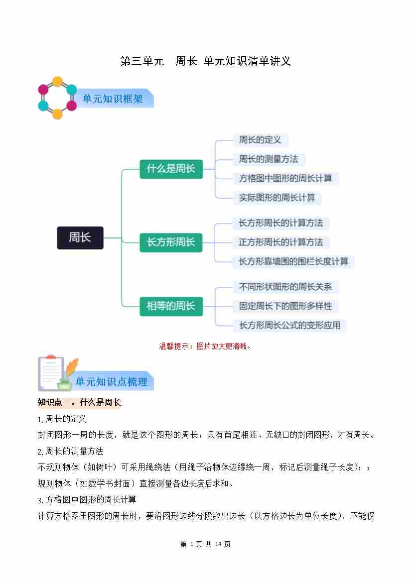 第三单元周长(知识清单)数学北师大版三年级下册(新教材)(解析版)