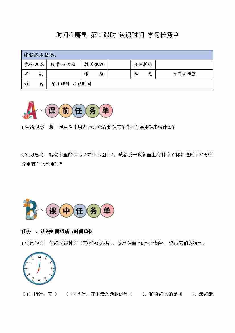 时间在哪里 第1课时 认识时间(学习任务单)(新教材)