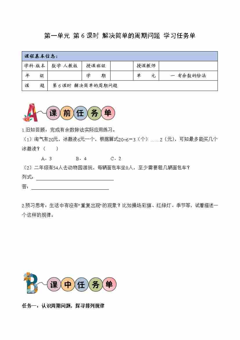 第一单元 第6课时 解决简单的周期问题(学习任务单)(新教材)