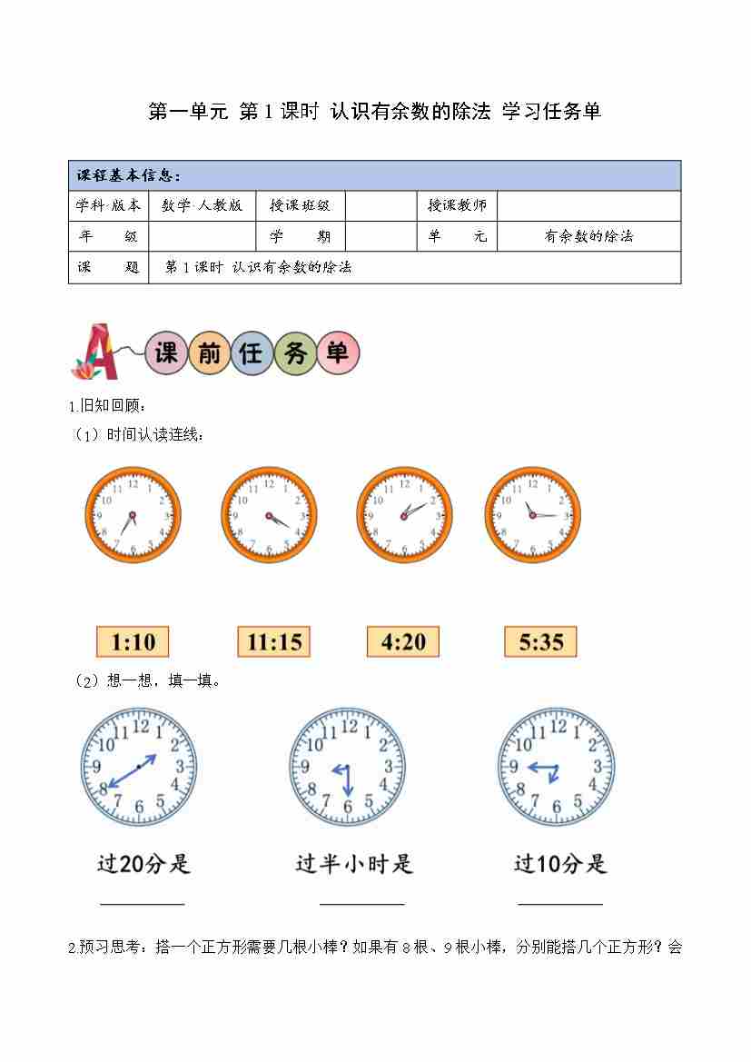 第一单元第1课时 认识有余数的除法(学习任务单)(新教材)