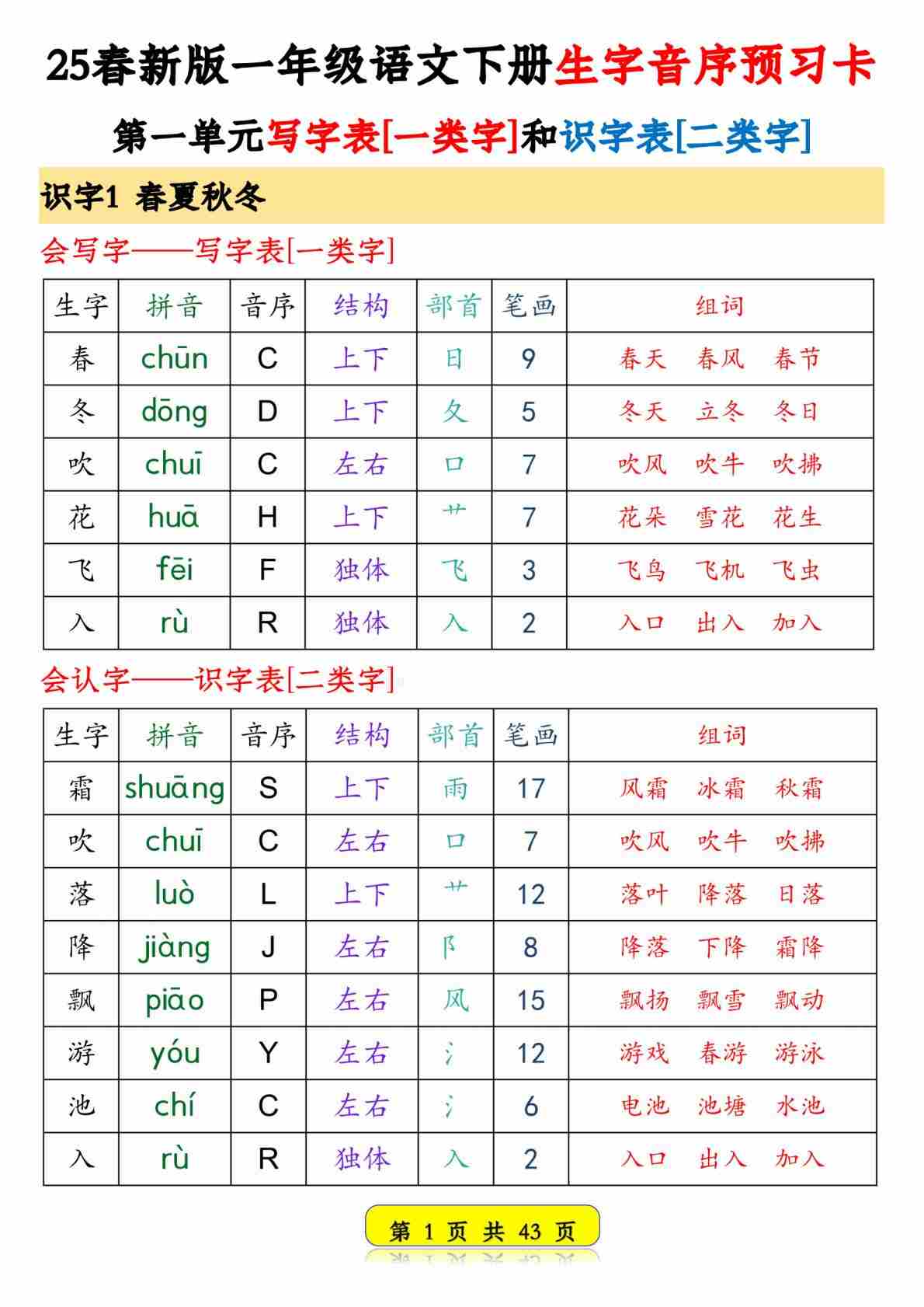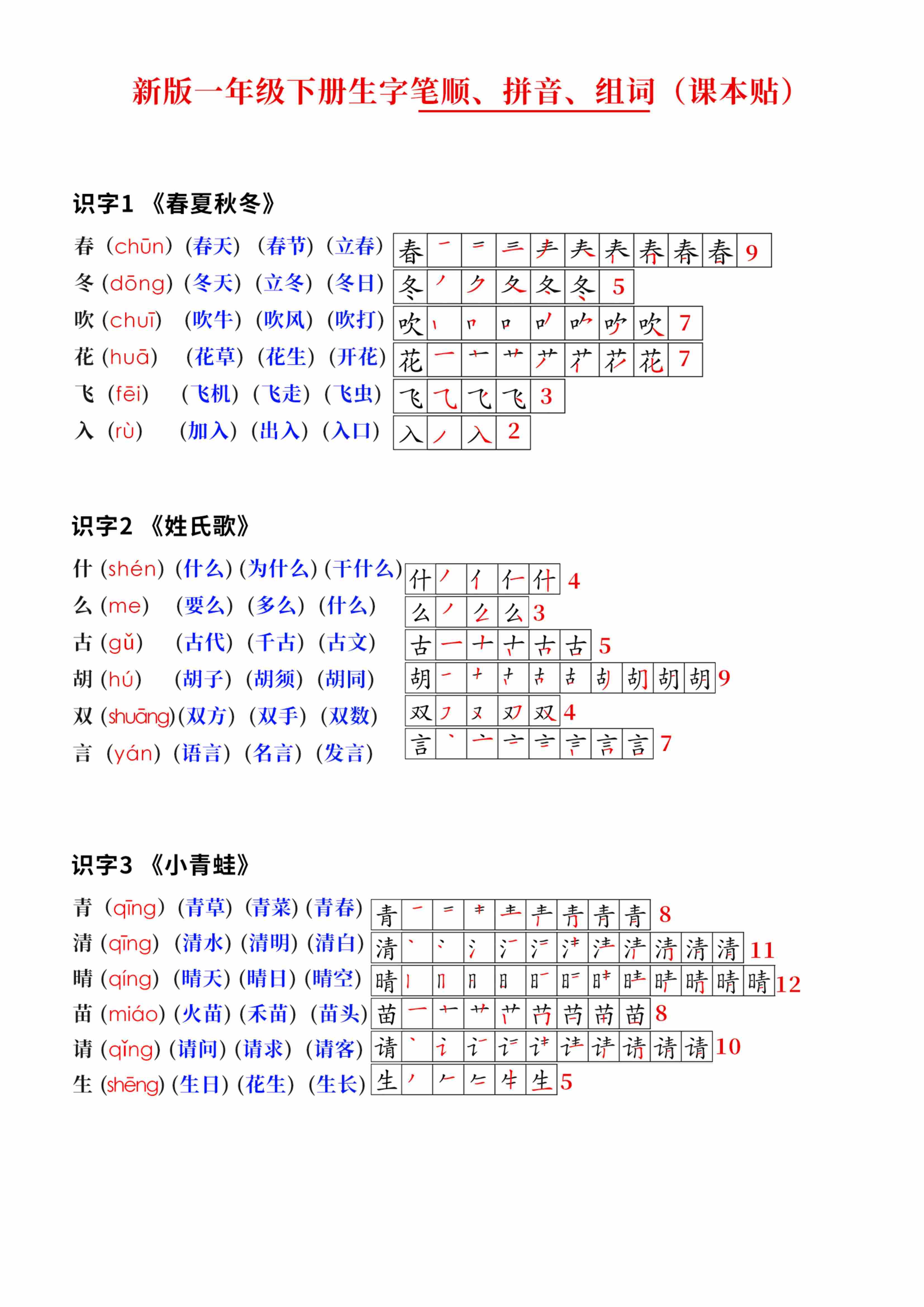 一(下)语文【25春(最新版)写字表-笔顺、拼音、组词、课本贴】