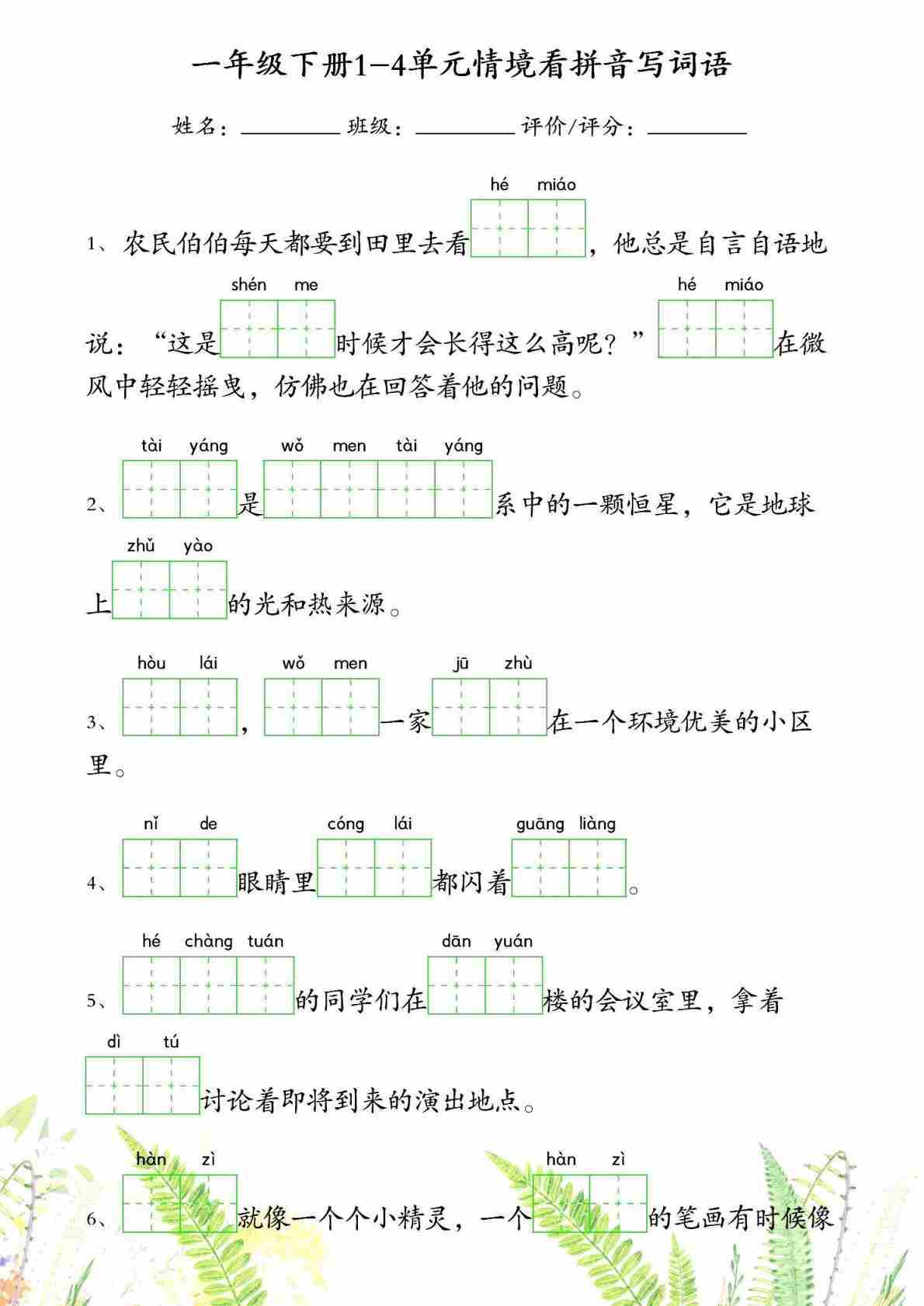 一 (下)语文【新版1-4单元看拼音写词语情境题】