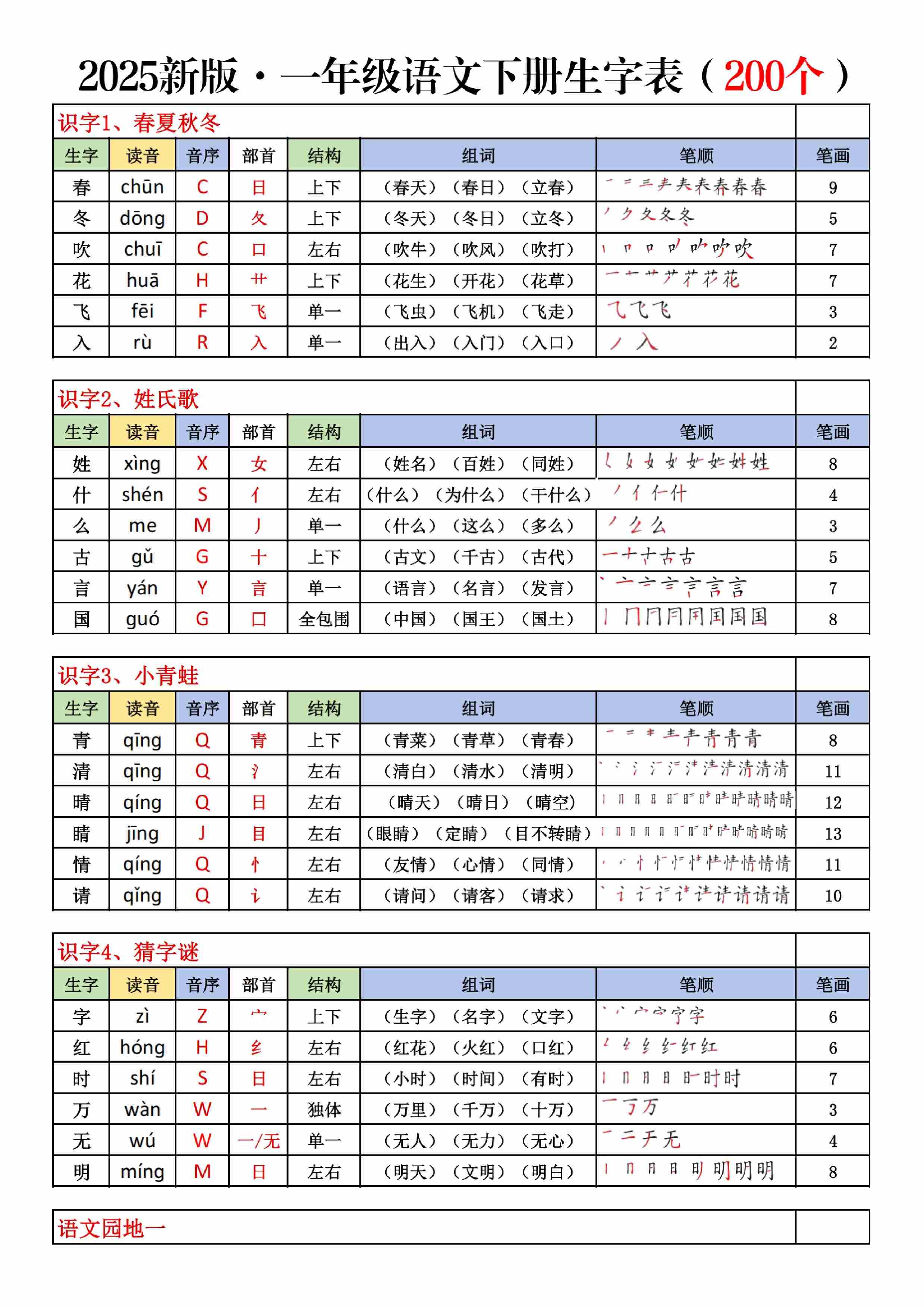 一(下)语文2025最新版一下生字表含笔顺(200字)
