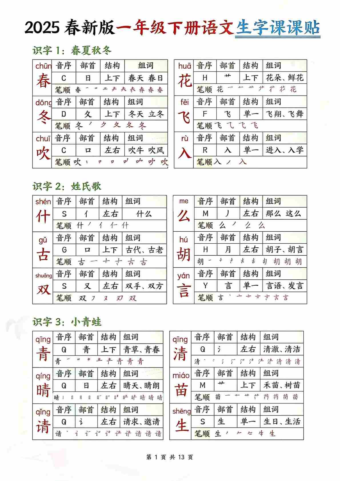 一(下)语文【25春(最新版)写字表-笔顺、拼音、组词、课本贴】