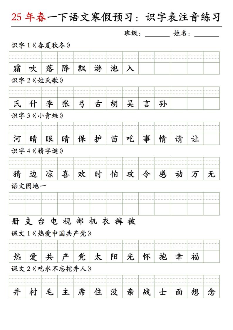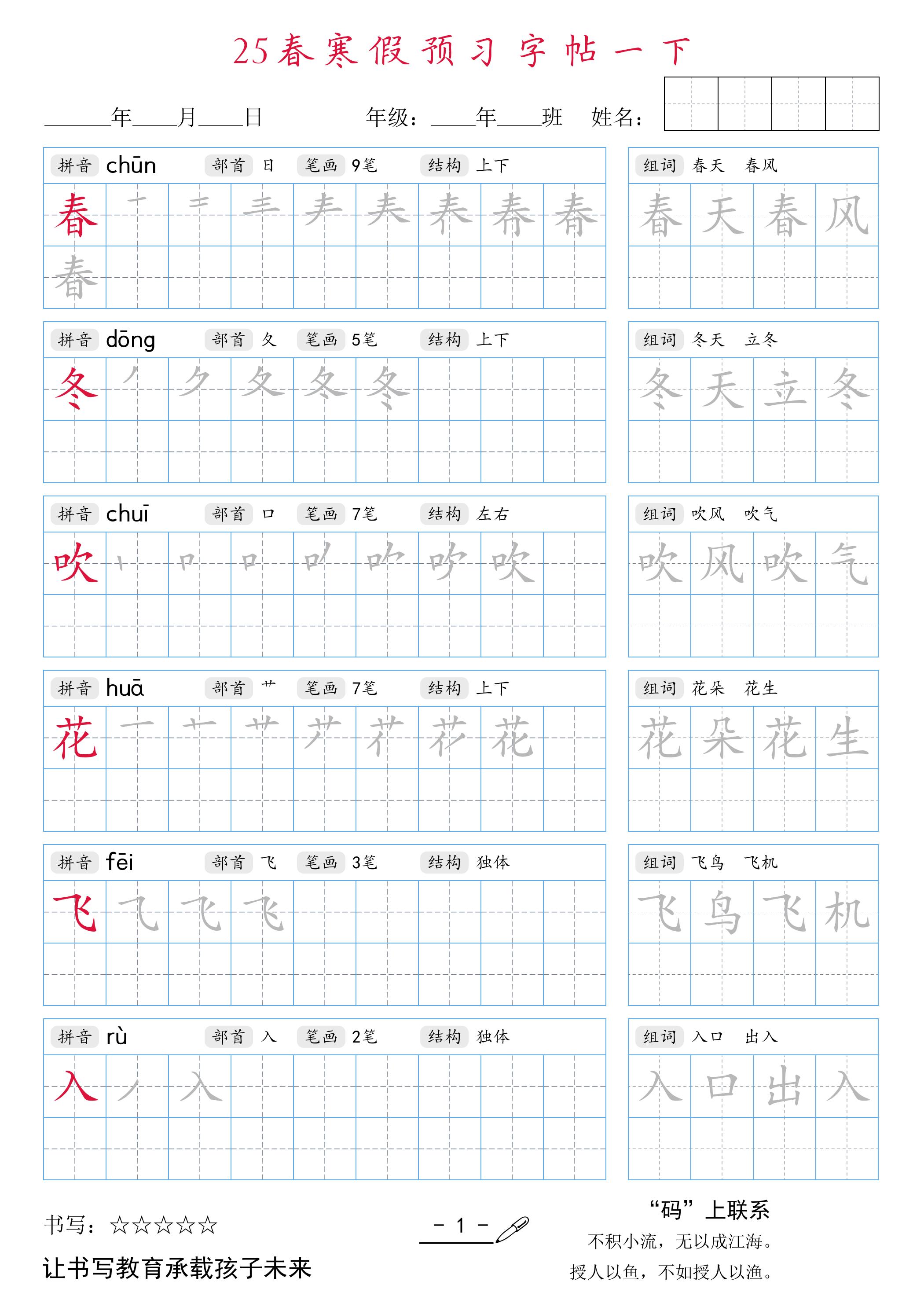 一年级语文【25春-寒假预习字帖】