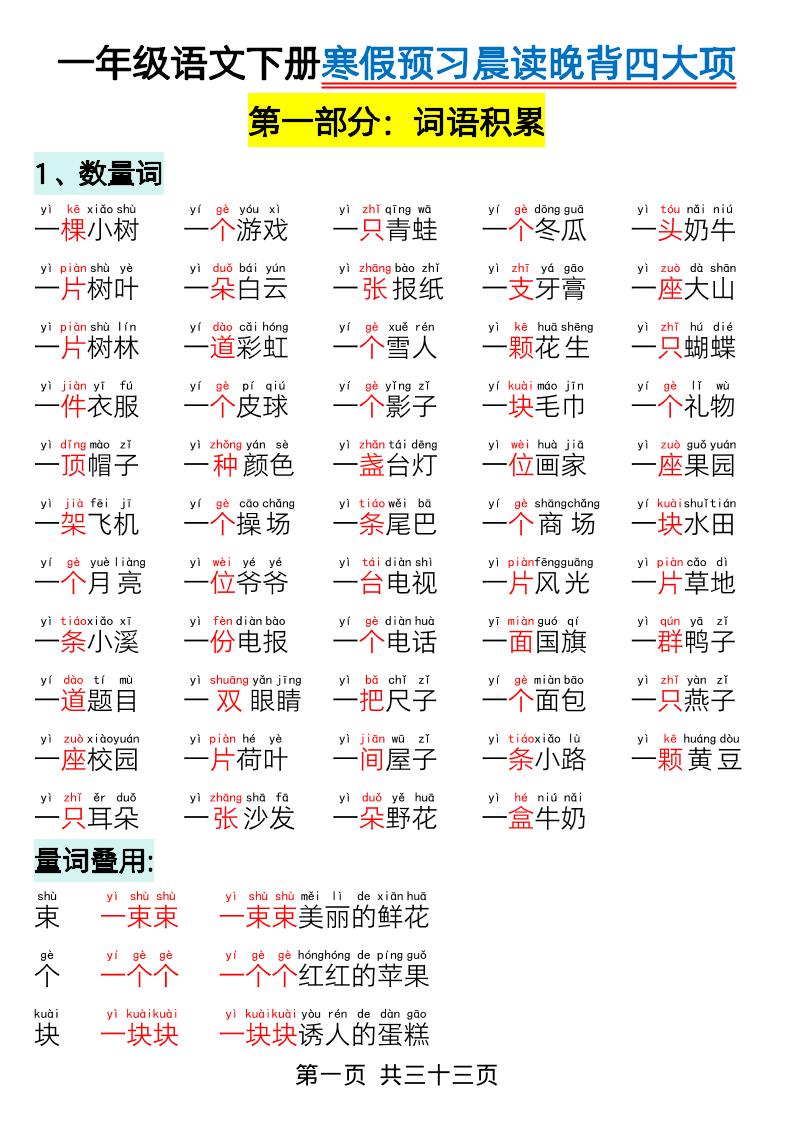 一年级语文【寒假预习-晨读晚背四大项】