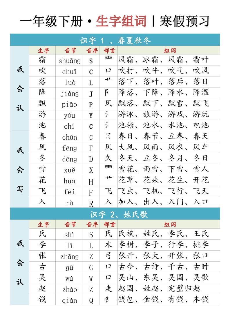 一(下)语文生字组词寒假预习