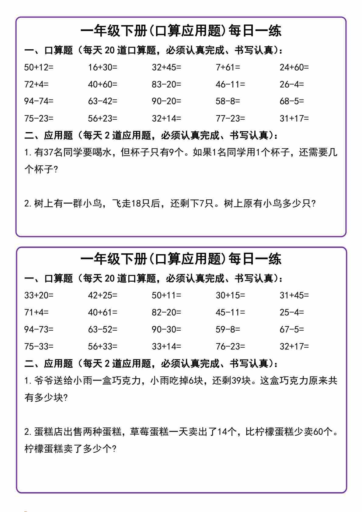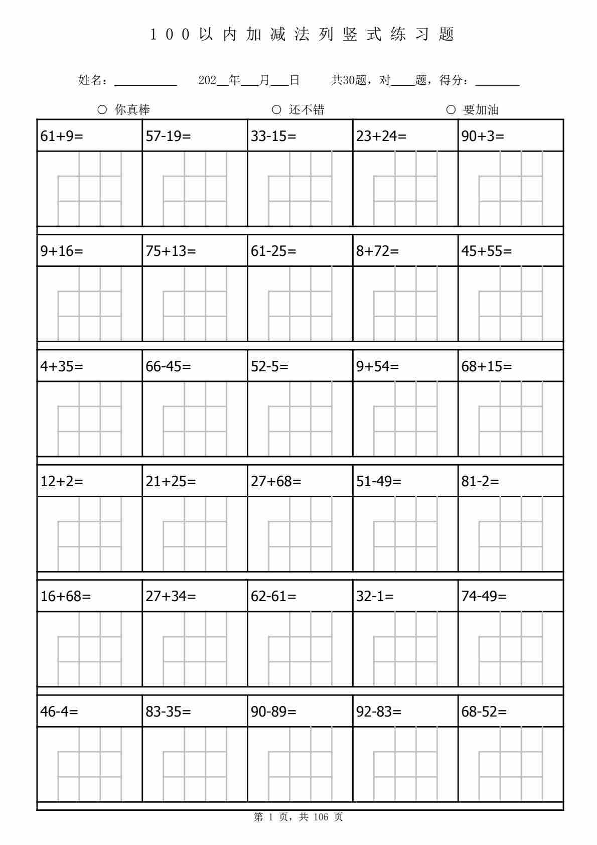 一(下)数学【25新】100以内加减法列竖式计算专项练习题3180题(106页)