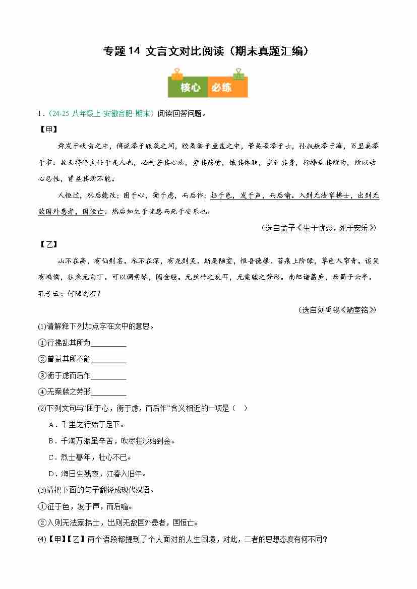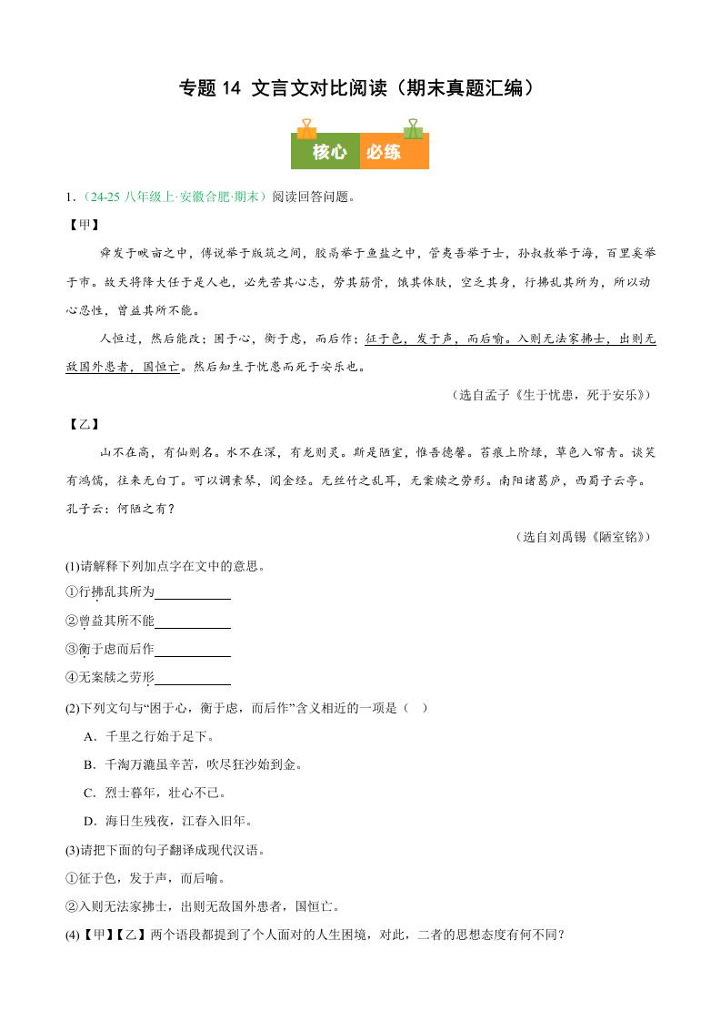 专题14 文言文对比阅读(期末真题汇编)八年级语文上学期新教材统编版(解析版)