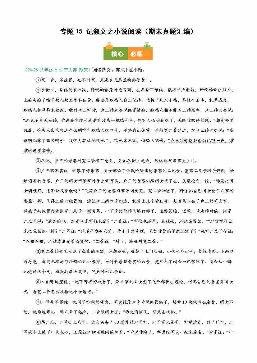 专题15 记叙文之小说阅读(期末真题汇编)八年级语文上学期新教材统编版(解析版)