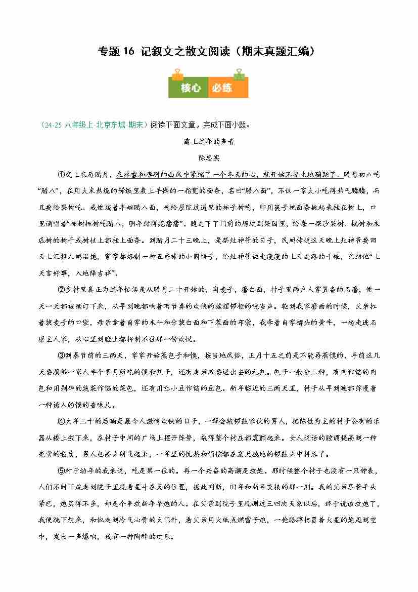 专题16 记叙文之散文阅读(期末真题汇编)八年级语文上学期新教材统编版(解析版)