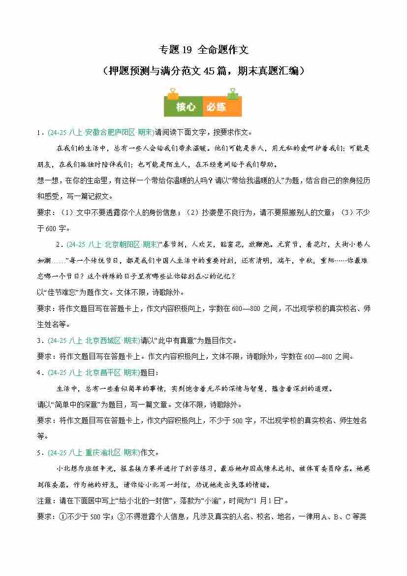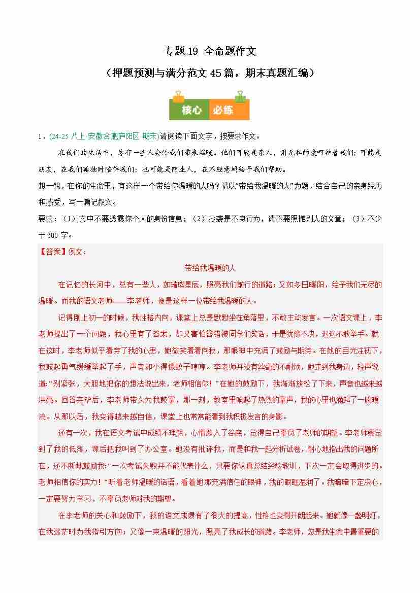 专题19 全命题作文(押题预测与满分范文45篇,期末真题汇编)八年级语文上学期新教材统编版(解析版)