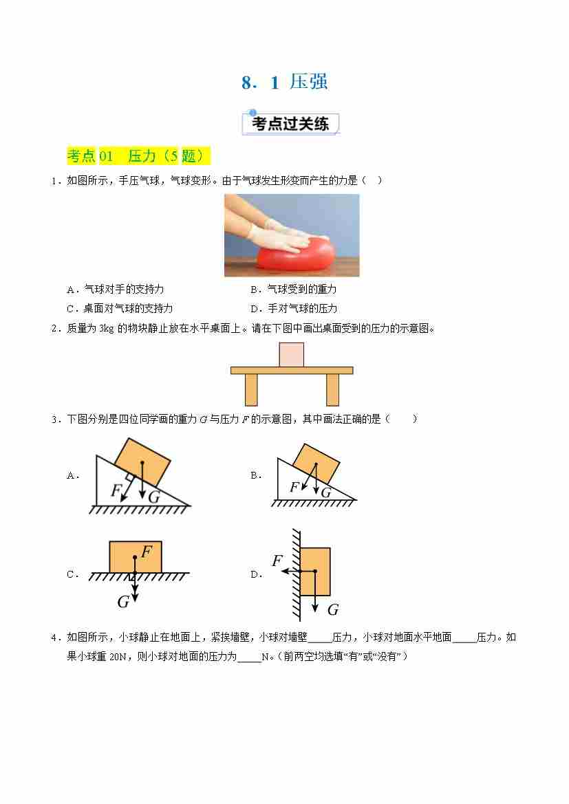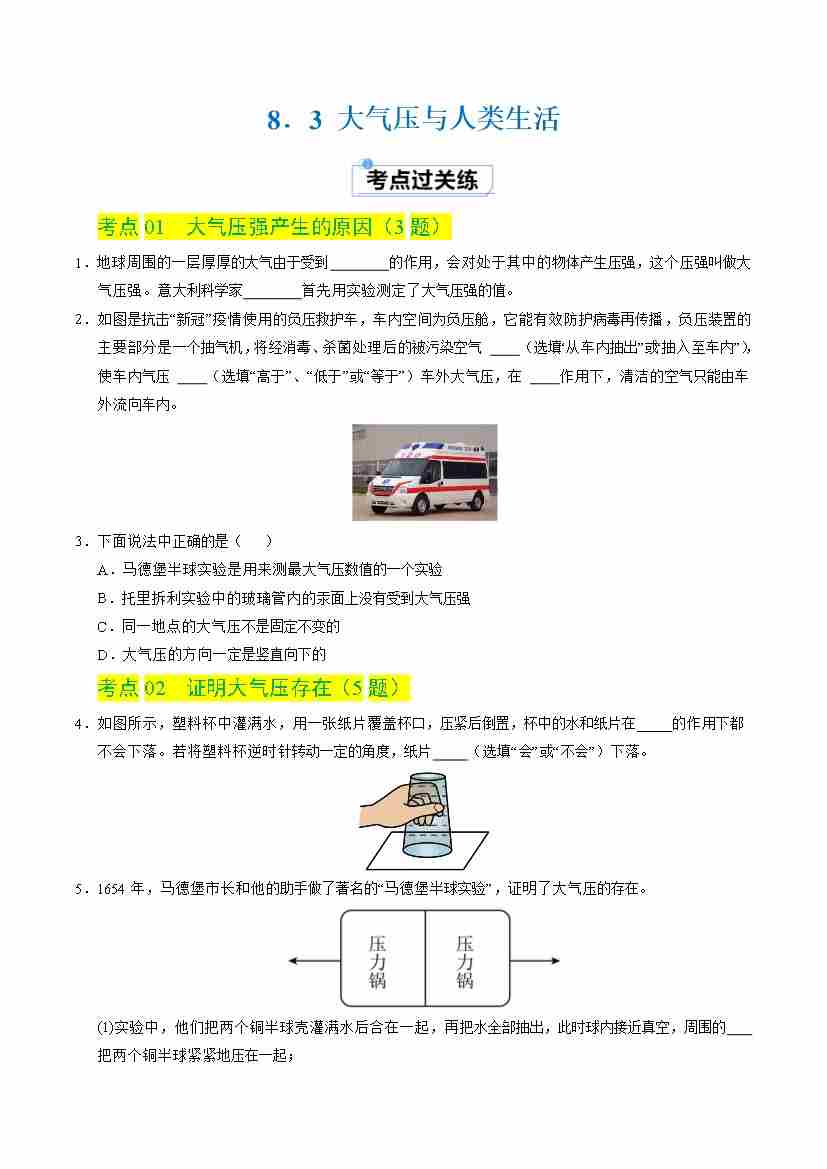 8.3 大气压与人类生活(分层练习)(原卷版)