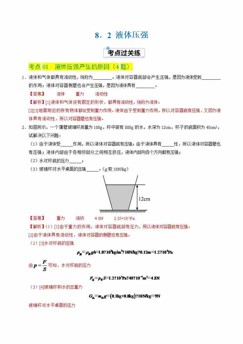 8.4 流体的压强和流速的关系(分层练习)(解析版)