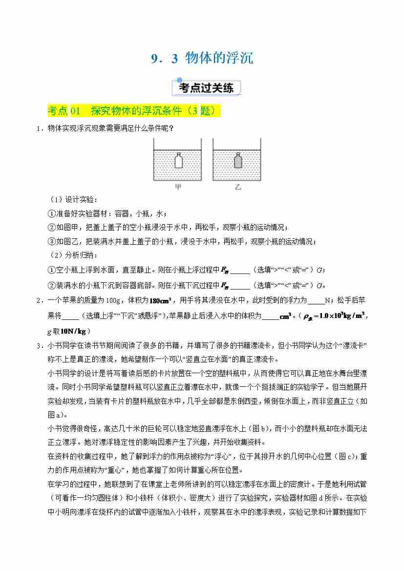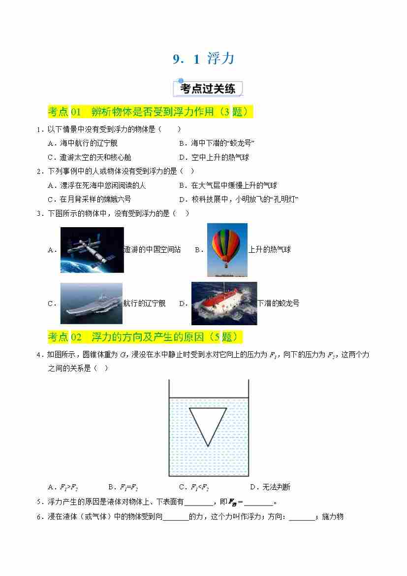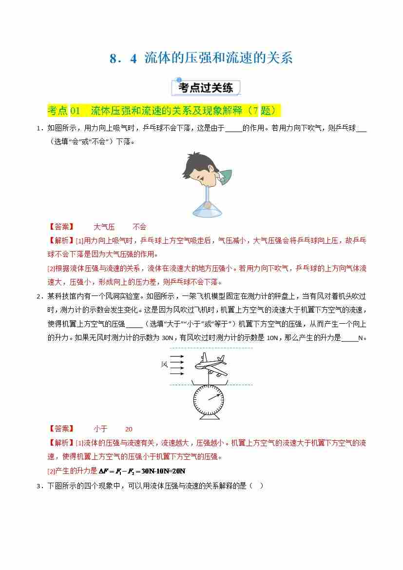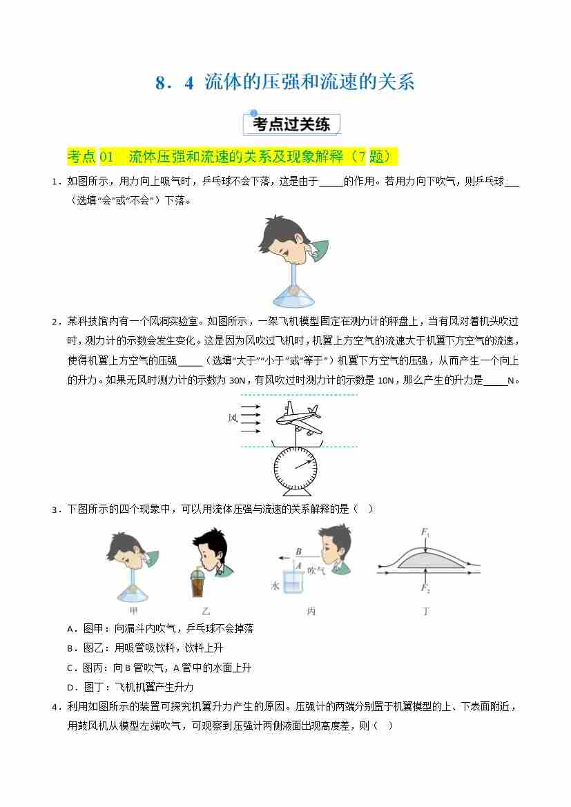 8.4 流体的压强和流速的关系(分层练习)(原卷版)