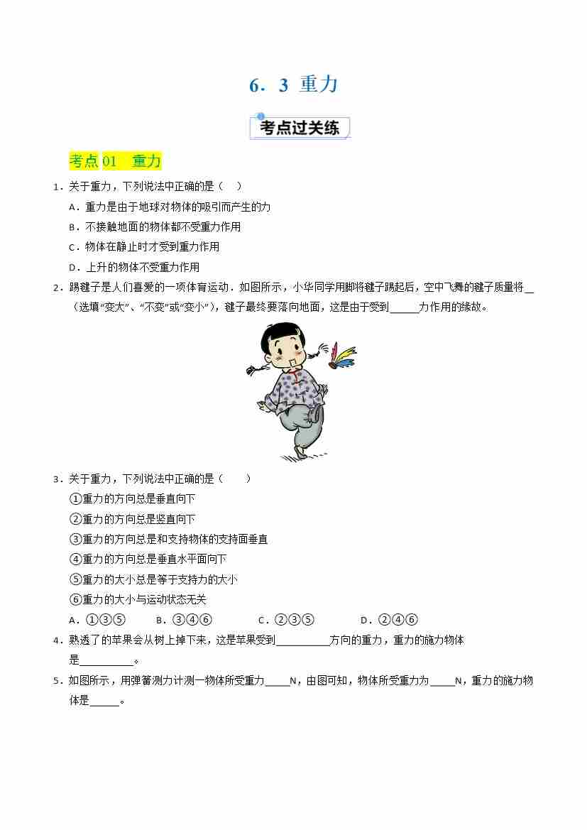 6.3 重力(分层练习)(原卷版)