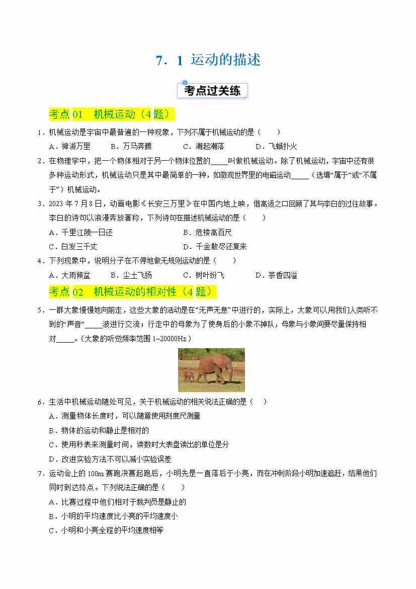 7.1 运动的描述(分层练习)(原卷版)
