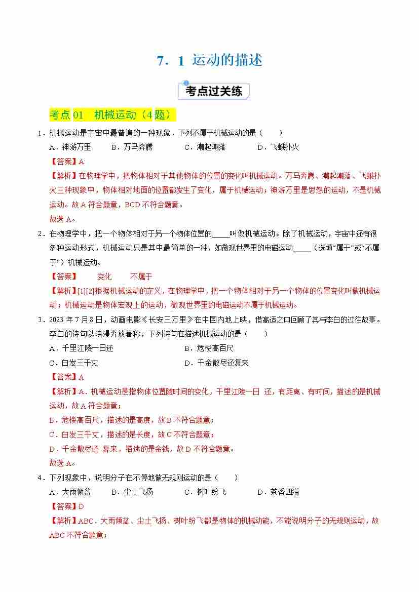 7.1 运动的描述(分层练习)(解析版)