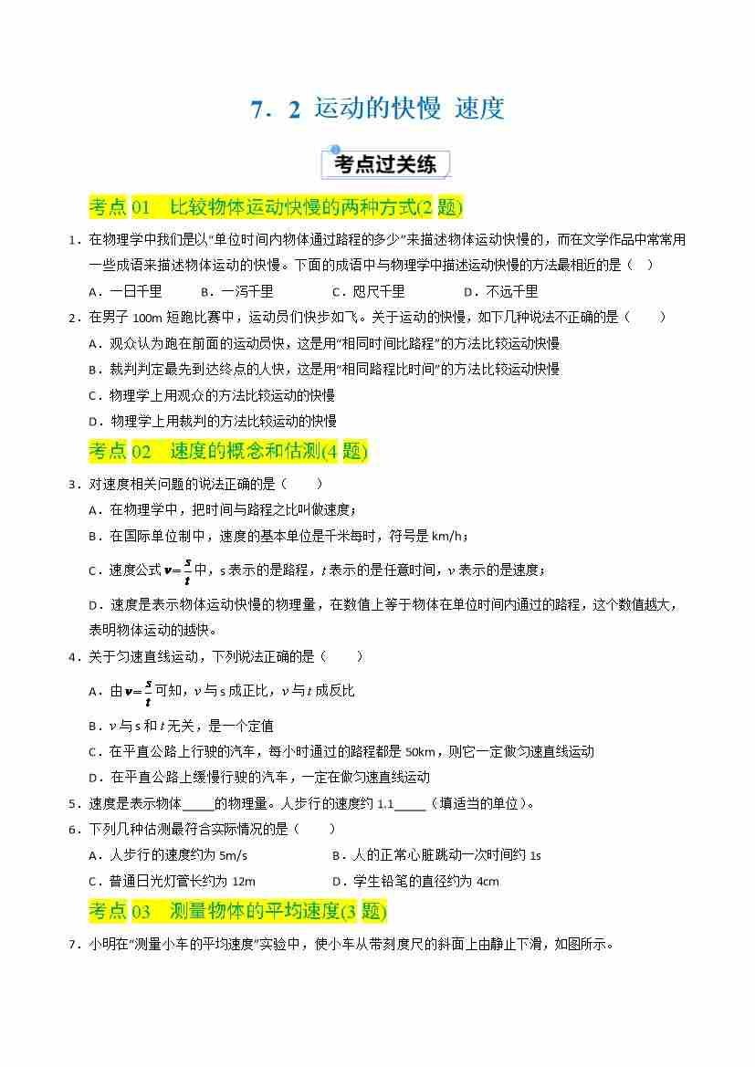 7.2 运动的快慢 速度(分层练习)(原卷版)