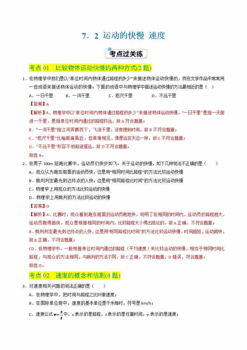 7.2 运动的快慢 速度(分层练习)(解析版)