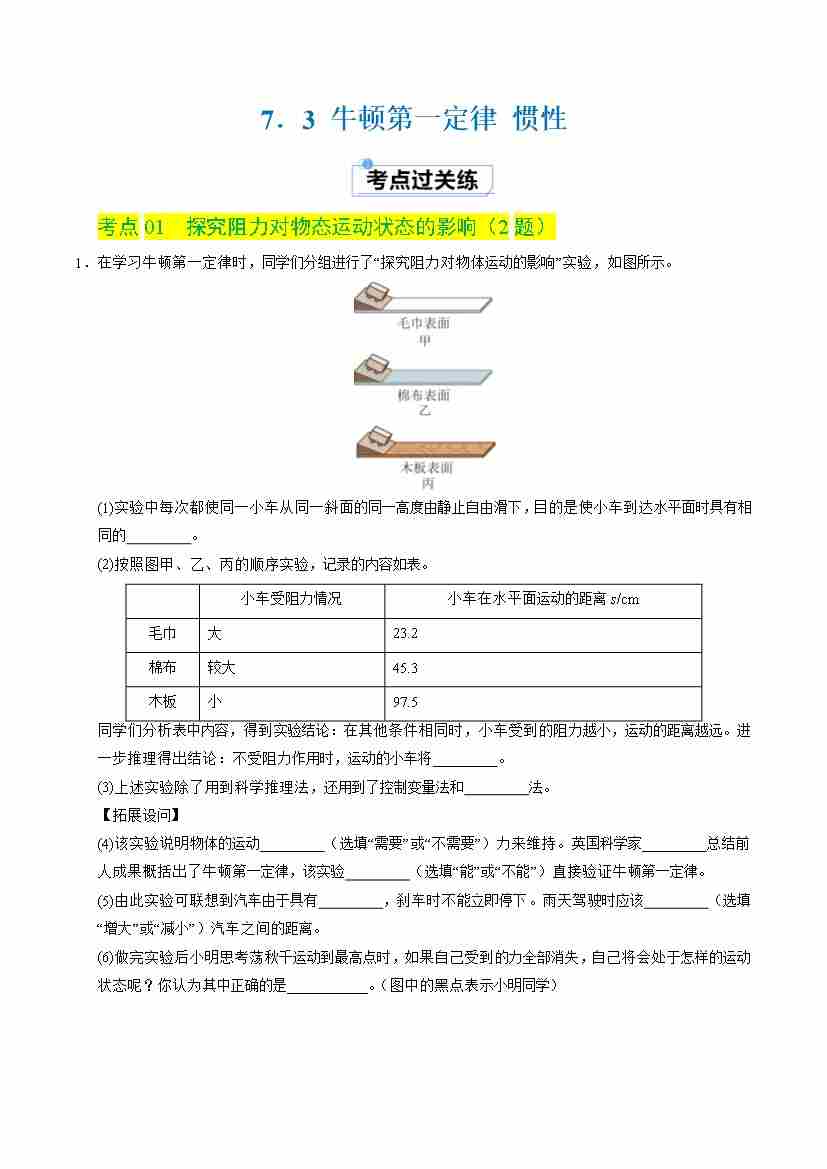 7.3 牛顿第一定律 惯性(分层练习)(原卷版)