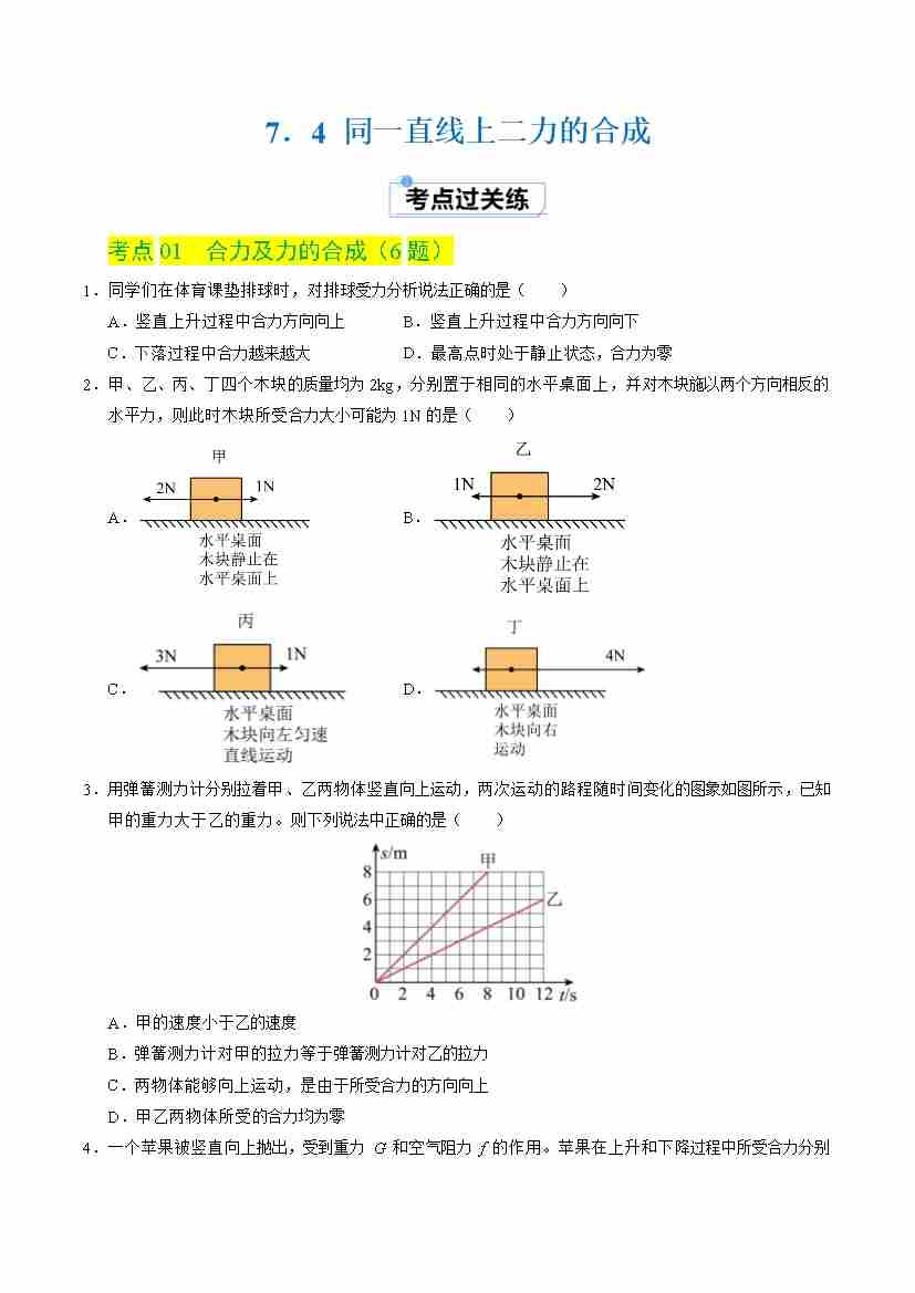 7.4 同一直线上二力的合成(分层练习)(原卷版)