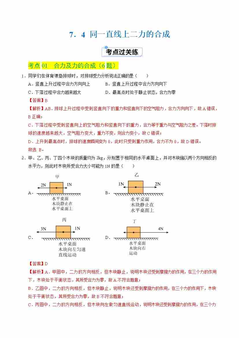 7.4 同一直线上二力的合成(分层练习)(解析版)