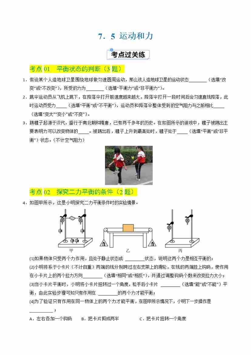 7.5 运动和力(分层练习)(原卷版)