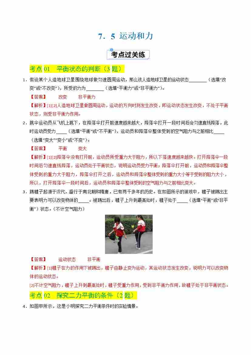 7.5 运动和力(分层练习)(解析版)