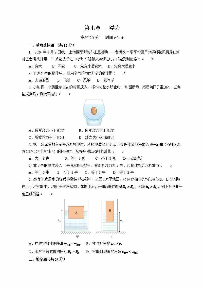第7章 浮力(单元自测卷)(试题版A4)