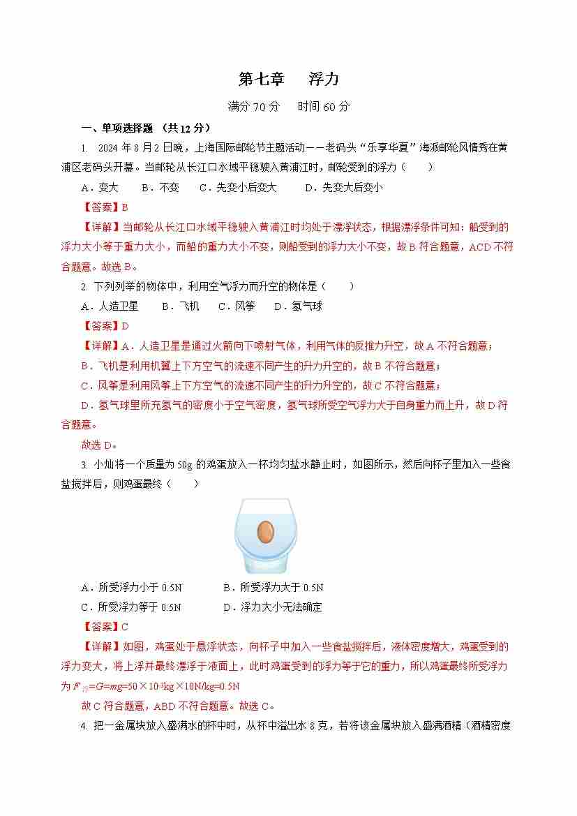 第七章 浮力(单元测试)(原卷版)