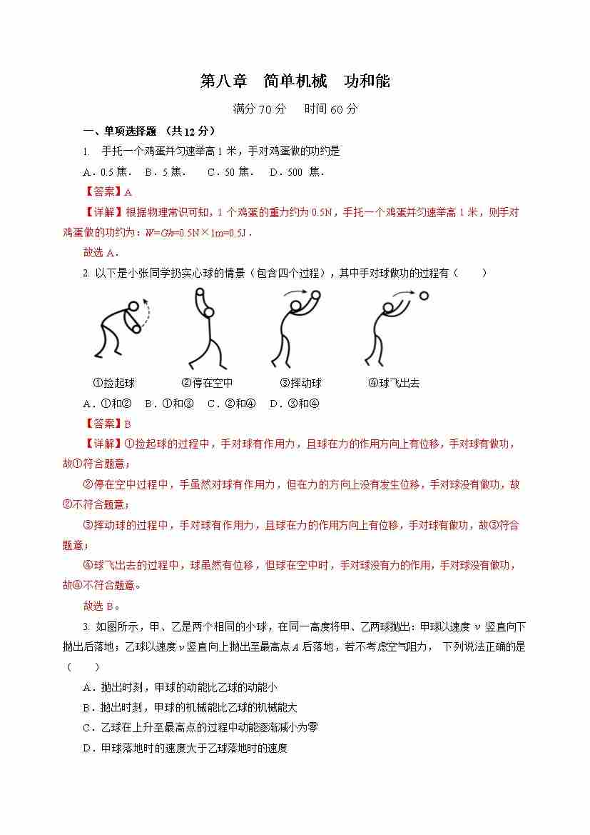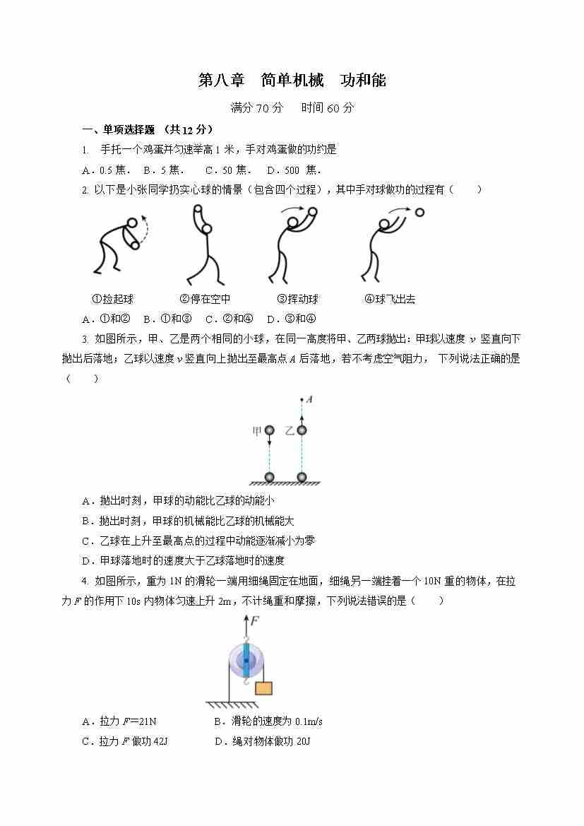 第八章 简单机械 功和能(单元测试)(原卷版)