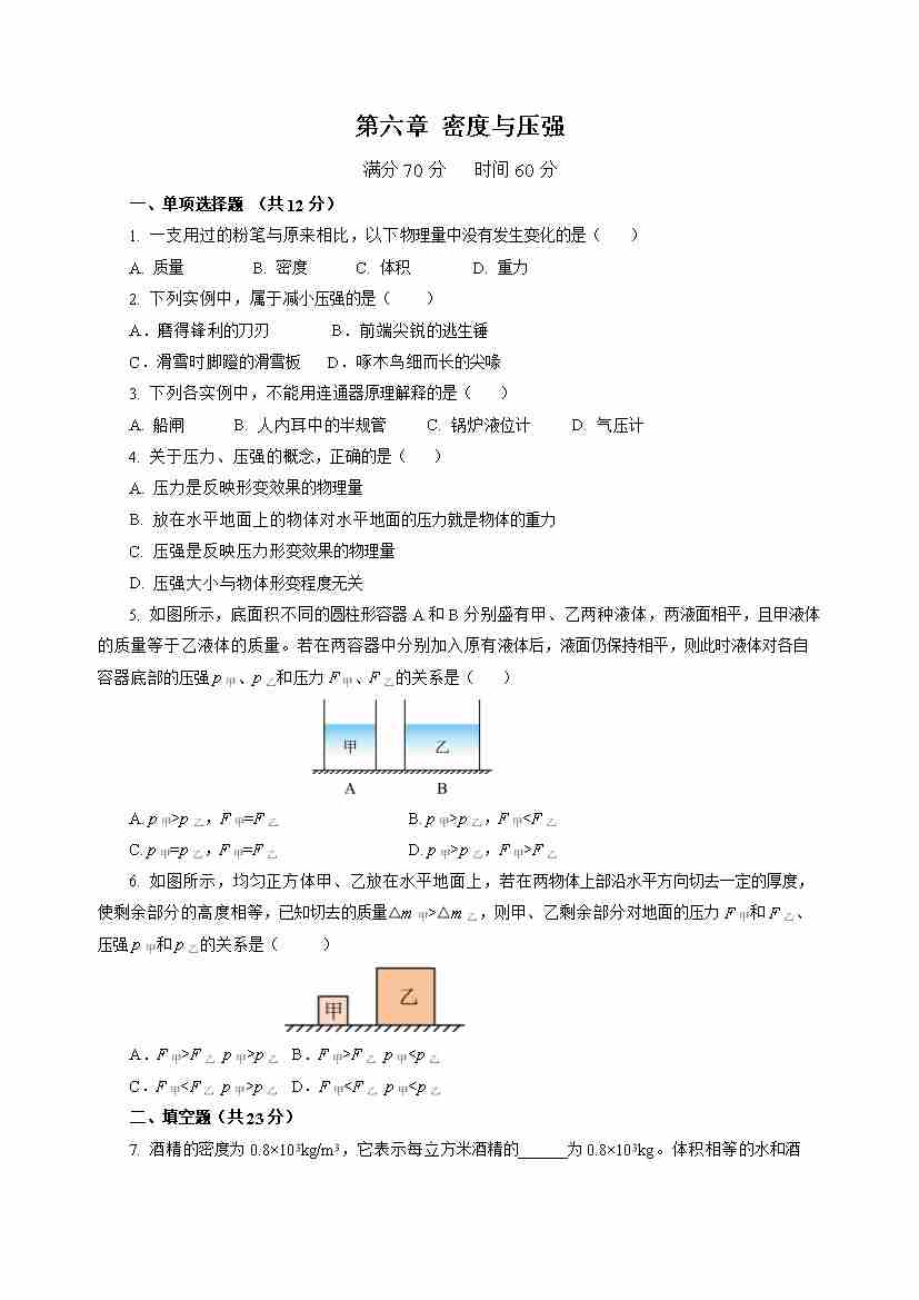 第6章 密度与压强(单元自测卷)(试题版A4)
